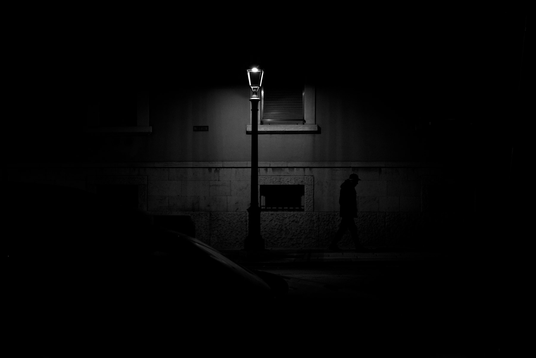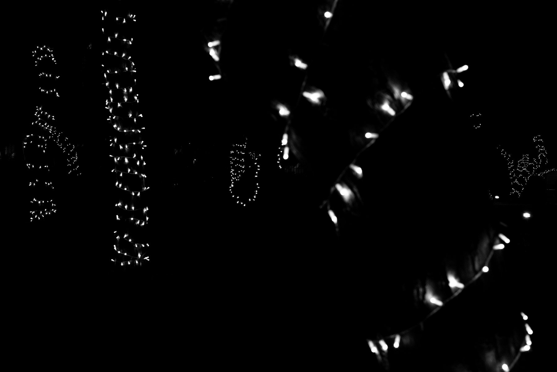 What emerged was a (very) small series of black and white photographs, quiet images that document corners of the city where artificial light draws brief halos in the dark: Christmas decorations tangled around trees; someone walking under a street lamp, a closed gazebo lit by a stray spotlight.